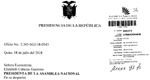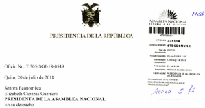 Usted tiene la responsabilidad y obligación de ignorar, devolver y denunciar el memorando SAN-2018-2760 (pdf) del 26 de julio de 2018 que le remitió extemporáneamente la Secretaria General de la Asamblea Nacional. Si usted admite este documento para trámite y consideración de la Comisión de Desarrollo Económico incurrirá en el uso de documentos falsos, hecho punible de acuerdo al inciso final del artículo 328 del Código Orgánico Integral Penal.