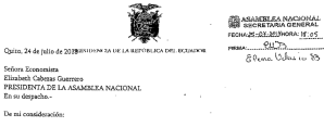 - El Presidente de la República firma una comunicación cuya cabecera dice «Quito, 24 de julio» cuando es de conocimiento público que el 24 de julio él se encontraba en Europa y no en Quito.