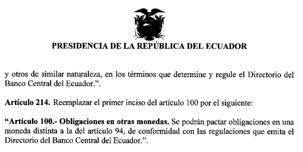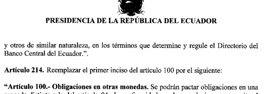 Mucho se ha escrito sobre los riesgos de esta ley para la desdolarización y de una crisis sistémica. Katiuska King, Pablo Dávalos, Pedro Páez, Marco Flores y este Observatorio lo hemos advertido. Sin embargo, luego de un cuidadoso análisis, hemos encontrado la evidencia más contundente de la planificación de la desdolarización: el artículo 214 del proyecto de ley económica urgente, mal apodada Ley de Crecimiento Económico, que ya pasó la primera instancia en el Pleno de la Asamblea.