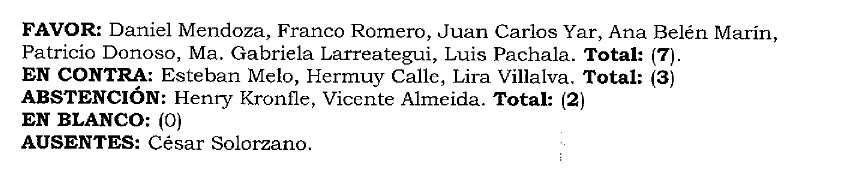 En la Comisión Legislativa respectiva, estos fueron los votos a favor de la ley, son ellos quienes deben cambiar su posición dentro la Comisión: Mendoza (AP), Romero (Independiente, ex PSC, ex CREO, aliado de AP), Yar (AP), Marín (AP, pero crítica), Donoso (CREO), Pachala (CREO) y Larreátegui (SUMA).