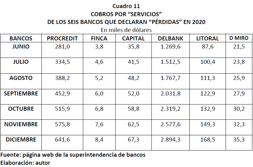 Entre los denominados “servicios” encontramos: las entregas de certificados de tener una cuenta bancaria, que tiene un costo de 3 a 5 dólares; entrega de cartolas de los cuenta ahorristas, donde registran depósitos o débitos, que tienen un costo de 1 a 2 dólares. Se podrá argumentar que algunos bancos ya no entregan cartolas y por tanto no cobran, lo que es cierto, pero, como ya no tenemos registro de nuestras transacciones, requerimos de un informe de nuestro movimiento financiero, lo que nos cuesta de 3 a 5 dólares, es decir, los banqueros salieron ganando por la supresión de la cartola; el retiro de dinero a través de los cajeros automáticos cuesta entre 35 y 70 centavos de dólar, caso contrario no debitan el dinero. Esto también se cobra en el retiro de los “bonos de ayuda” o “de pobreza”, retiro de las pensiones jubilares o préstamos quirografarios del IESS; en el pago de servicios de agua, energía eléctrica, teléfono.