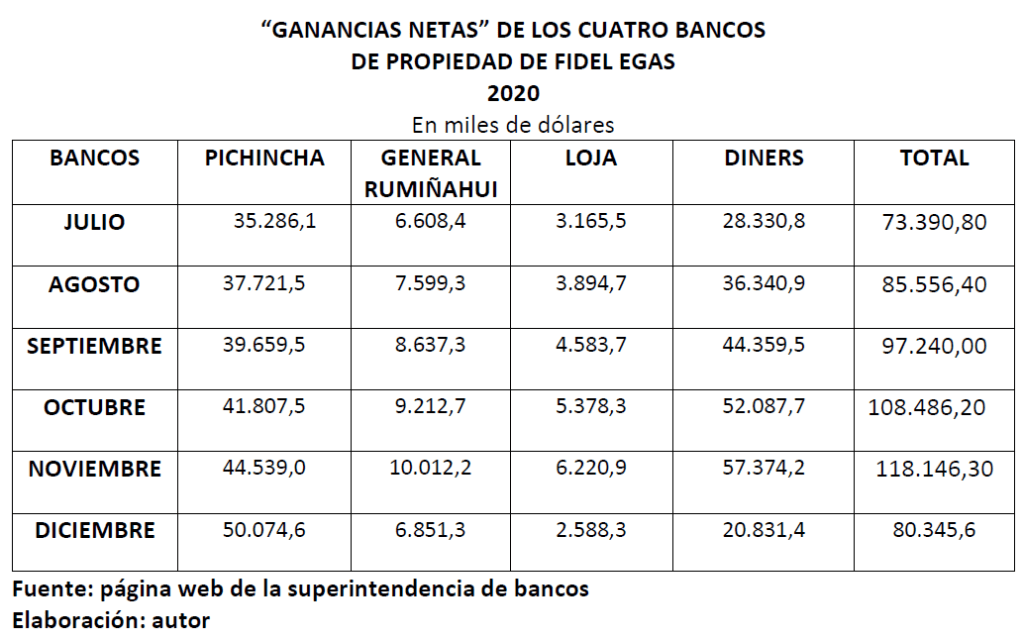 Son ínfimas y ridículas las “ganancias” que declaran los bancos más grandes del Ecuador. Lo impresionante de las ganancias no solo son los montos, sino, que en los seis últimos meses de la mayor parálisis económica por la pandemia sanitaria, la tendencia es ascendente de las ganancias, que alcanzan a los CIENTOS TREINTA Y TRES MILLONES DE DÓLARES, esto es más del 57% de la totalidad de la banca. Lasso principal accionista del Banco de Guayaquil, es el segundo en ganancias, en plena pandemia.