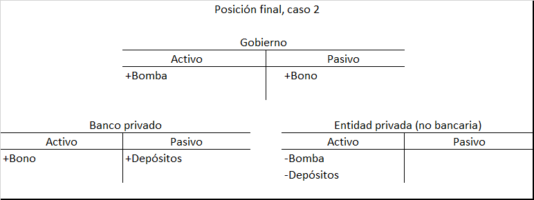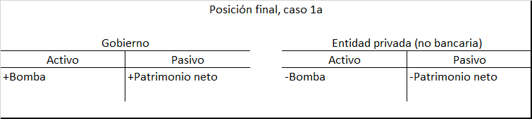 El activo financiero neto permanece en forma de un bono del tesoro en lugar de reservas. En comparación con el Caso 1a, ¡el sector privado es mucho más feliz! Su riqueza total no cambia, pero la riqueza se convirtió de un activo real (bomba) a un activo financiero (derecho al gobierno).