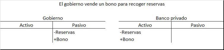 Durante la Introducción analizamos el caso general del gasto público, los impuestos y la venta de bonos. Para resumir brevemente, observamos que cuando un gobierno gasta se genera un crédito simultáneo al depósito bancario de alguien y al depósito de reserva del banco en el banco central; los impuestos son simplemente el reverso de esa operación: cuando se ejecutan, se genera un débito en una cuenta bancaria, así como, en las reservas bancarias. Las ventas de bonos se realizan debitando las reservas de un banco. Con el propósito de proporcionar una explicación más sencilla, es conveniente consolidar las cuentas del tesoro y del banco central en una “cuenta del gobierno”.