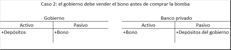 Hemos asumido que el banco no tenía reservas adicionales para debitar cuando el Tesoro (Ministerio de Finanzas) movió su depósito, por lo tanto, el banco central tuvo que prestar las reservas al banco privado (temporalmente, como veremos más adelante). Ahora el tesoro tiene su depósito en el banco central, sobre el cual puede emitir un cheque para comprar la bomba.
