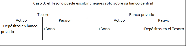Note además que el resultado final es exactamente como se indicó anteriormente utilizando el ejemplo de un gobierno consolidado (tesorería y banco central): el gasto público deficitario conduce a un crédito en la cuenta bancaria de alguien y a un crédito de reservas en un banco; estos a su vez luego se intercambian por una tesorería para extinguir el exceso de reservas. Sin embargo, con los procedimientos efectivamente adoptados, las transacciones son más complejas y la secuencia es distinta. No obstante, la posición final del balance es la misma: el gobierno tiene la bomba y el sector privado tiene una tesorería.