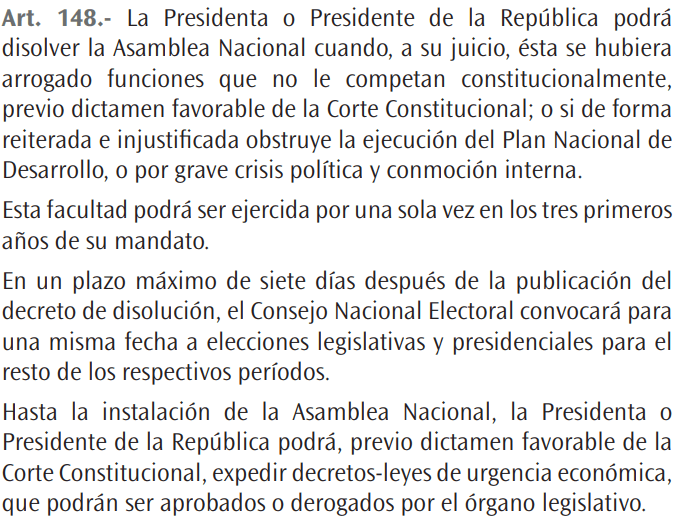 A través del mecanismo conocido como «muerte cruzada», es decir, la disolución de la Asamblea Nacional por parte del Ejecutivo, este puede expedir decretos-leyes de urgencia económica, sin que estos pasen por el poder Legislativo.