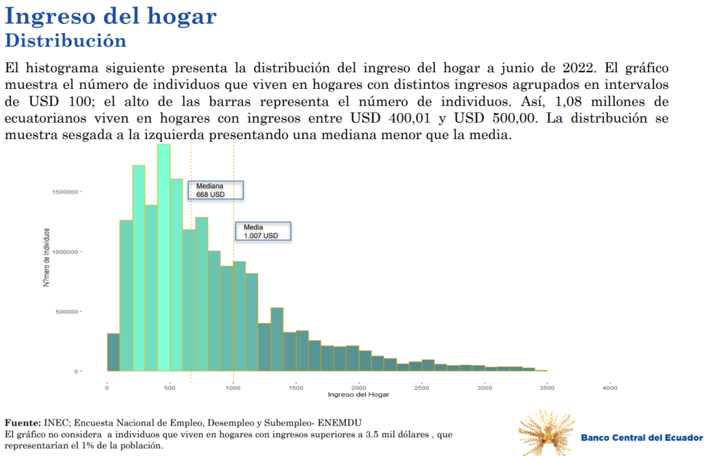 El reporte de pobreza del Banco Central del Ecuador incluía, digo incluía porque desde mediados del anterior año ese reporte pasó a manos del INEC y se realiza una publicación mucho más limitada, incluía un histograma del ingreso del hogar. Hasta entonces, alrededor de la mitad de la población vive en hogares con ingresos de menos de USD 668 mensuales (y la mayoría de ellos con menos de USD 500 mensuales). Como referencia, la Canasta Familiar Básica a junio de 2023 es de USD 772,35. De allí que tengamos noticias casi todos los meses acerca del endeudamiento familiar: que 8 de cada 10 familias tuvieron que endeudarse para comprar la lista de útiles en la Costa, que los consumos con tarjeta de crédito han aumentado, y endeudándose para gastos del día, ¡increíble!. Pero lo peor es que aún hay medios que escriben que a los ecuatorianos nos falta cultura de ahorro. ¿Cómo vamos a tener cultura de ahorro si no hay ingresos para ahorrar?