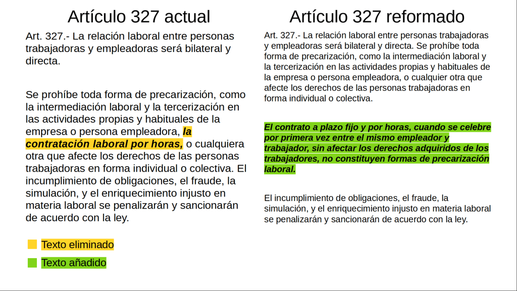 De acuerdo con el texto, en realidad lo que se aprueba es la inclusión de algo llamado «contrato por horas» ( y algo llamado «contrato por plazo fijo», aunque este ya se ha reincorporado desde el año 2020), pero la definición y la regulación de ese contrato por horas se delega al Ministerio de Trabajo.