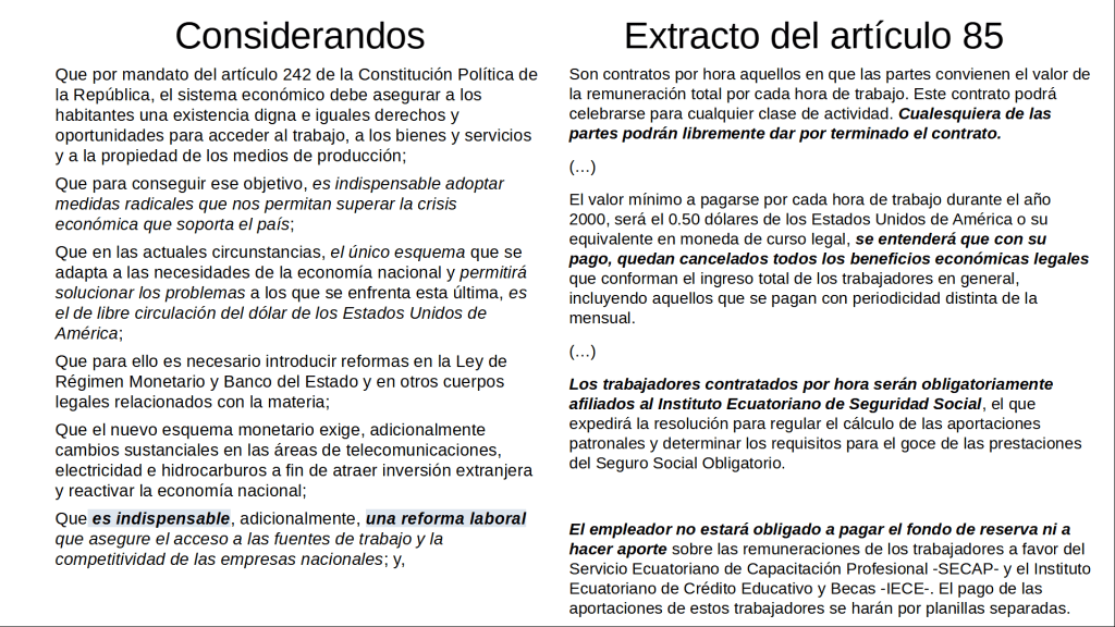 El contrato por horas no es una figura nueva en el Ecuador. La contratación por horas fue incorporada mediante el art. 85 de la Ley para la Transformación Económica del Ecuador (Ley Trole, marzo de 2000). En su momento, esta ley se aprobó como una parte del paquete de reformas necesarias para aplicar la dolarización y asegurar «el acceso a las fuentes de trabajo y la competitividad de las empresas nacionales». Como hemos discutido en otros artículos, este tipo de medidas no son necesarias para sostener la dolarización, sino más bien parece que la dolarización se convierte en una excusa para promover este tipo de medidas.