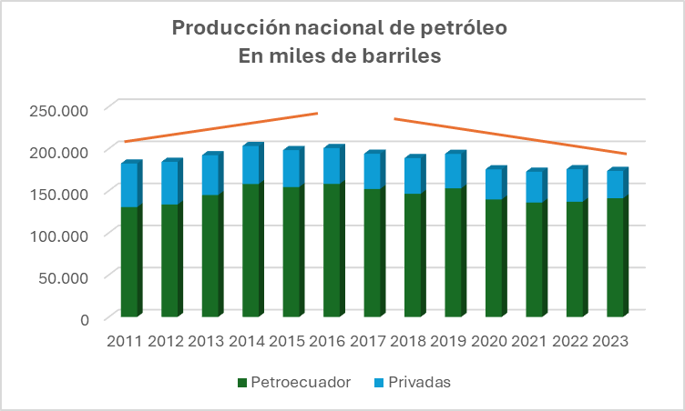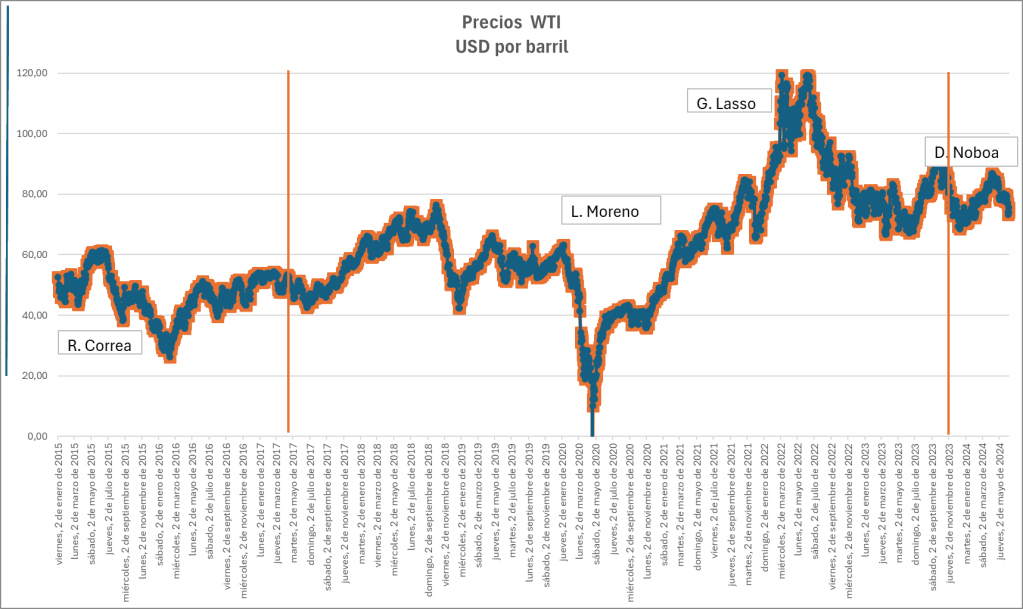 El precio del barril de crudo WTI, referencia del crudo ecuatoriano, ha sido históricamente volátil y por tanto su gestión para utilizarlo como instrumento anticíclico se torna indispensable. Más allá del precio promedio de cada administración gubernamental, cabe resaltar las tendencias: Lasso se benefició de un alto precio del petróleo, aún considerando la caída en 2023, el promedio llega a US $ 80. Pese a que el precio experimentó una ligera disminución con Noboa se mantiene sobre los US $70. Moreno tuvo un precio promedio sobre los US $50, incluyendo la paralización de la crisis sanitaria. Correa en su segunda administración experimentó el precio más bajo, ubicándose en menos de US $40, debiendo afrontar el terremoto de 2016 que obligó a solicitar al FMI un instrumento de financiamiento rápido (IFR), sin condicionamiento, que ascendió a US $364 millones.