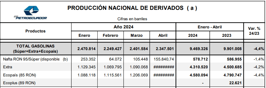 Esta tendencia decreciente continua con el Gob. del Nuevo Ecuador en donde los tres complejos de refinamiento de combustibles muestran menor producción de combustibles al comparar la variación entre 2023 y 2024, correspondiente a los meses de enero, febrero, marzo y abril.