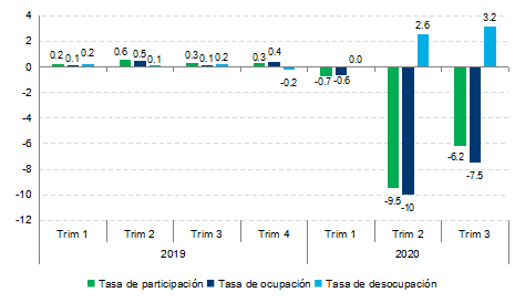 A mediados de 2020, con la apertura gradual de las actividades económicas, las tasas de ocupación y participación regionales aumentaron. El aumento de esta última se produjo debido al retorno progresivo al mercado laboral de aquellas personas que habían estado económicamente inactivas en los trimestres anteriores inmediatos. Por esta razón, ni el incremento en la tasa de ocupación ni en la tasa de participación condujeron a una reducción de la tasa de desocupación.