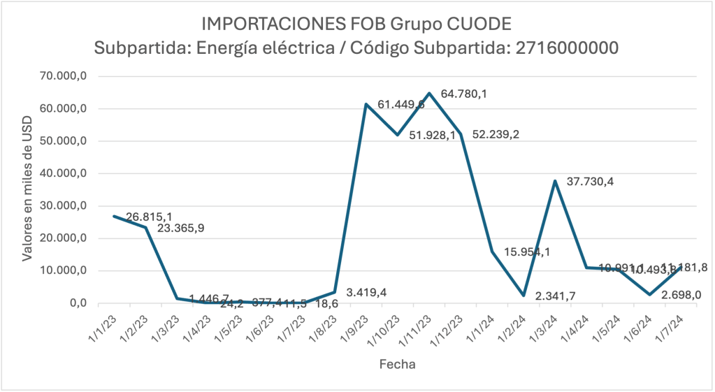 Durante el segundo trimestre de 2024, el Ecuador experimentó un aumento significativo en las importaciones de energía eléctrica y combustibles. Según el Banco Central del Ecuador (BCE), las importaciones de electricidad alcanzaron los USD 24,2 millones, representando un incremento exponencial respecto a los USD 413.105 del segundo trimestre de 2023, es decir se incrementó en un 5753,9% según el mismo Banco Central. Esto se debió a la combinación de estiaje y a la paralización de la producción en refinerías clave, lo que obligó al país a buscar fuentes de energía en el exterior.