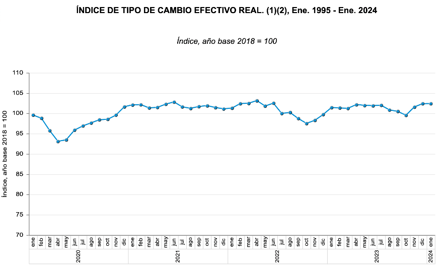 En enero de 2024, el TER se ubicó en 102,47, indicando una leve apreciación comparada con el cierre de 2023.