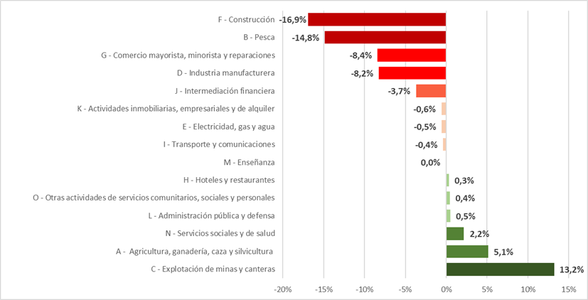 - Pierden sectores que destinan su producción al mercado doméstico en competencia con importaciones (industria manufacturera y comercio) o son proveedores del Estado (construcción).