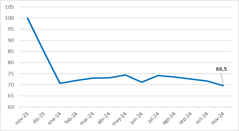 Para la trayectoria de los ingresos del sector privado no registrado —aproximadamente un cuarto del total de trabajadores— los datos que publica el INDEC muestran una caída acumulada de casi 18 puntos respecto a noviembre-2023. No obstante, atento que los ingresos de este sector se publican con 5 meses de rezago, el último dato corresponde a lo ocurrido con estos salarios en abril 2024. Si en cambio observamos la evolución del Salario Mínimo Vital y Móvil (Gráfico 3), indicador que es una referencia para algunos salarios de los trabajadores informales, la pérdida de poder adquisitivo alcanza a noviembre de 2024 casi el 30%