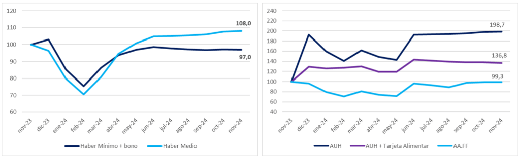 El valor de la AUH alcanzó en noviembre un 98,7% de aumento real. El aumento se explica porque el gobierno duplicó su valor en diciembre de 2023 y por el ajuste de la nueva fórmula de movilidad. No obstante, gran parte de los beneficiarios de la AUH cobran también el programa Tarjeta Alimentar, programa que presenta una actualización discrecional. Si consideramos ambas prestaciones, el aumento real a noviembre alcanza el 36,8%.