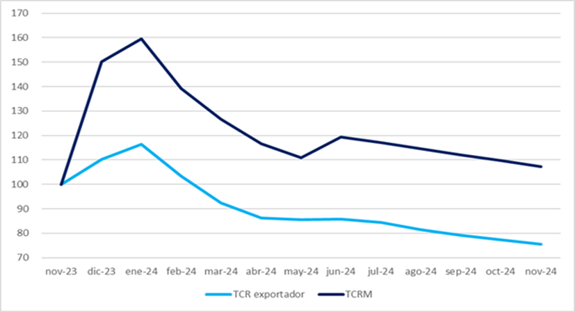 Gráfico 2. Evolución del dólar oficial y dólar “blend”. Nov-2023=100.