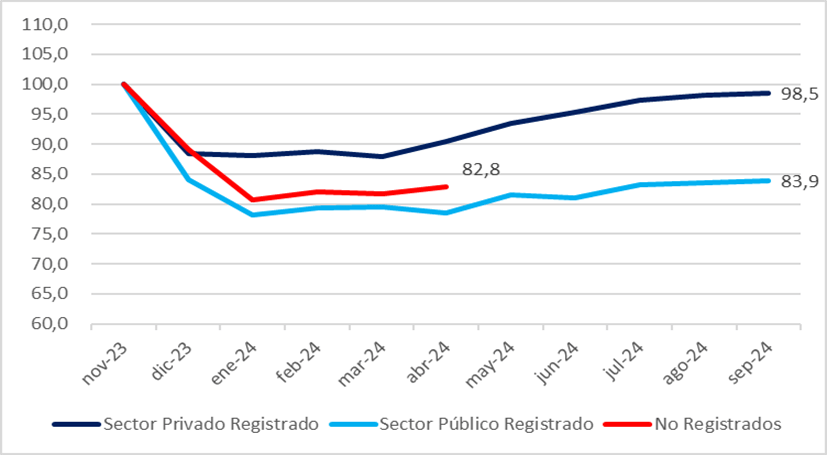A nivel ingresos, es posible diferenciar entre ingresos salariales e ingresos por prestaciones sociales. Como fuera explicado en el informe de coyuntura de noviembre 2024, existe una recuperación parcial y muy heterogénea dentro de los salarios. La primera gran diferencia es entre trabajadores del sector privado y del sector público. A septiembre de 2024, los salarios registrados del sector privado se encuentran en promedio 1,5 p.p. por debajo del nivel de noviembre de 2023, mientras que los salarios del sector público alcanzan una caída de más de 16 p.p. (Gráfico 4). A su vez, al interior de los salarios del sector privado registrado observamos gran heterogeneidad entre ramas sectoriales (Tabla 4).