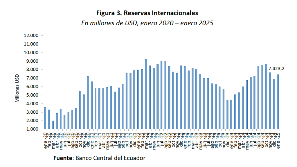 Las reservas internacionales son un componente crítico para un país dolarizado, ya que actúan como un colchón para absorber shocks externos y garantizar la convertibilidad de la moneda. En el caso de Ecuador, estas reservas están compuestas principalmente por activos líquidos en dólares, como depósitos en el extranjero, bonos del Tesoro de Estados Unidos y oro. Según el Boletín Monetario Semanal No. 864 del Banco Central del Ecuador (BCE), las reservas internacionales al 21 de febrero de 2025 alcanzaron un saldo de USD 7.928,6 millones, con un aumento de USD 17,2 millones respecto a la semana anterior. La gestión de las reservas internacionales es ineficiente al concentrarse las inversiones en el exterior y lo que hace Sacha en manos del Estado (Petroecuador) es inyectar recursos directamente a la estructura más solida de las reservas (depósitos de las instituciones públicas) con lo cual se tiene mayores grados de libertad para la gestión macroeconómica.