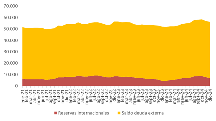Todo ingreso y salida de dólares del país pasa por las reservas internacionales pues estas constituyen el sistema de pagos de Ecuador con el exterior (Carvajal, 2022). En ese sentido, una cosa es el dinero que tiene el Ministerio de Finanzas y otra los dólares que hay en las reservas internacionales. Si el gobierno, por ejemplo, debe pagar en un año por concepto de servicio de deuda externa USD 5.000 millones y en las reservas internacionales solo hay USD 4.000 millones, el pago no se lo podrá ejecutar, independientemente de cuanto haya recaudado el gobierno. Esto significa que una de las principales vulnerabilidades de Ecuador es el elevado saldo y servicio de deuda externa en relación con las reservas internacionales.