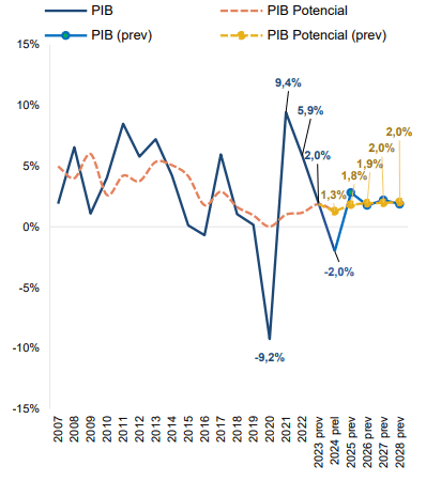 Si bien la contracción hubiese sido menor, de todas maneras consiste en una tasa de variación negativa consistente con la desaceleración de la economía luego del rebote post pandemia. En 2021, la producción creció 9,4%, pero desde 2022 a la actualidad la tasa de crecimiento promedio ha sido de 2% en línea con el débil crecimiento que se observa desde 2015. En los últimos diez años, la tasa de crecimiento promedio ha sido de 1,3%, mientras que la variación del PIB per cápita ha sido de 0,1%. Esto significa que la desaceleración del crecimiento luego de 2021 consiste en la economía retornando a su tasa de crecimiento de largo plazo, la cual es baja por problemas estructurales relacionados con la nula complejidad de las exportaciones. Además, este débil desempeño de la economía es profundizado por una política económica enfocada exclusivamente en equilibrar las cuentas fiscales y olvidando completamente los objetivos de desarrollo y crecimiento.