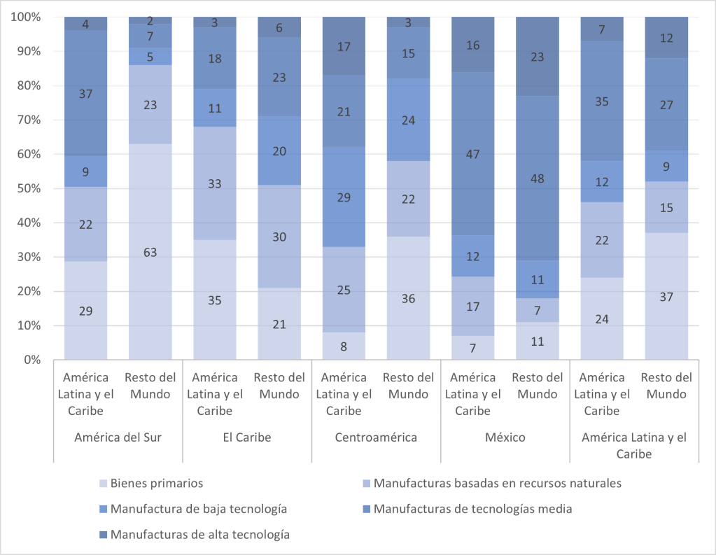 El comercio intrarregional de los países de América Latina, si bien menos cuantioso en comparación con el comercio total de la región, resulta particularmente representativo en términos de valor agregado. Esto se evidencia en la composición de las exportaciones según intensidad tecnológica.