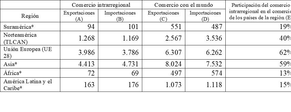 Nota: La participación del comercio intrarregional en el comercio de los países de la región se calcula como E = (A+B)/(C+D)