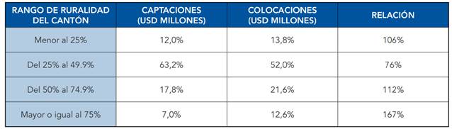 También las cooperativas, coherentes con su identidad comunitaria, captan recursos en cantones con menor ruralidad para dirigir la colocación de crédito a sectores con mayor ruralidad[3]. Lo anotado se observa con claridad en la tabla 2.