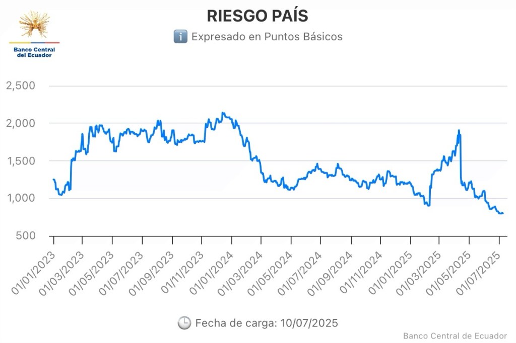 Artículo: El riesgo país de Ecuador cae por debajo de los 800 puntos.