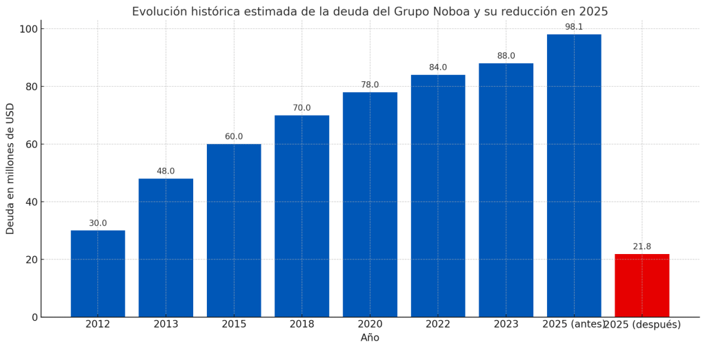 Evolución histórica estimada de la deuda tributaria del Grupo Noboa (2012–2025). Fuente: Elaboración propia con base en datos oficiales del SRI (2023–2025), Resolución NAC-DGERCGC25-00000015 (SRI, 2025), y la Ley Orgánica de Integridad Pública (Registro Oficial Suplemento No. 318, 2025). Elaborado por: Kevin José Collaguazo