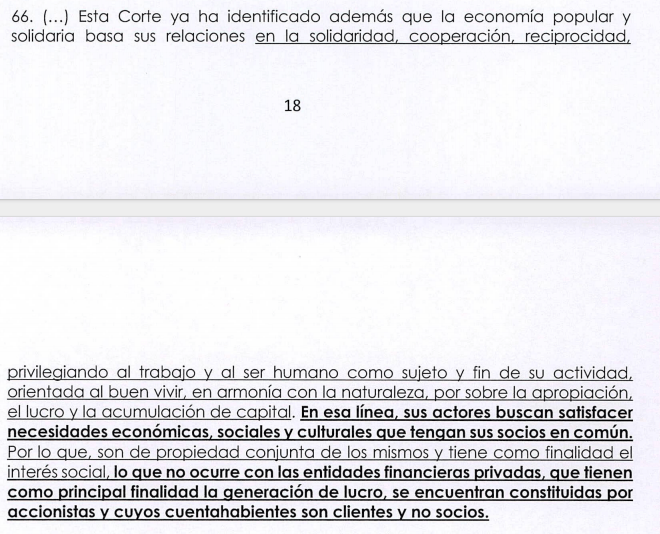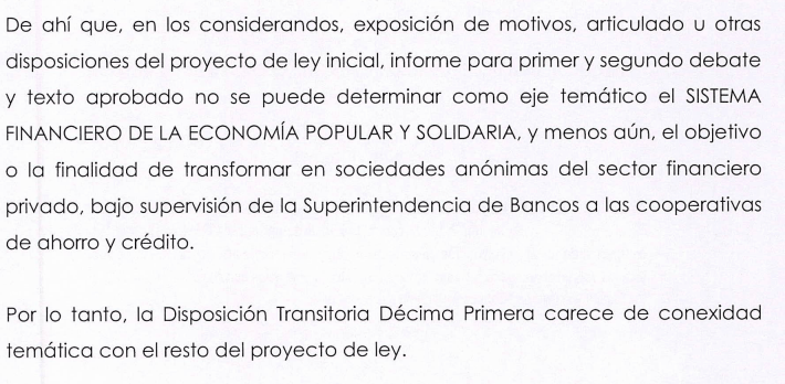Una de estas demandas tiene que ver con la disposición transitoria décimo primera de la mencionada Ley, misma que obliga a las Cooperativas de Ahorro y Crédito (COACs) a convertirse en sociedades anónimas, esto es en Bancos privados, contradiciendo una serie de artículos de la Constitución estructurados alrededor del sistema económico popular y solidario (fundamentalmente los Arts. 283, 309, 311)