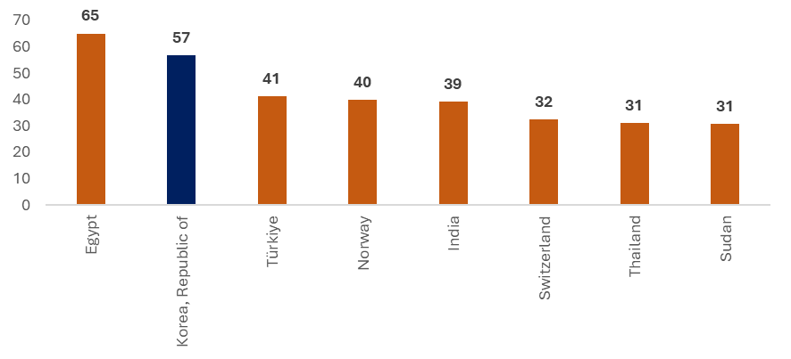 Con respecto a los aranceles que enfrentan los productos ecuatorianos en el país asiático, es importante destacar que este país tiene un historial de imponer aranceles altos a los productos agrícolas extranjeros. Por ejemplo, según datos de la Organización Mundial del Comercio, el arancel promedio de Nación Más Favorecida (MFN) de Corea del Sur para productos agrícolas es de 57%, solo por detrás de Egipto que tiene un arancel promedio de 65% (Figura 3). Específicamente, el arancel promedio MFN que enfrentan las frutas, vegetales y plantas es de 58,9%. Por otra parte, los productos de origen animal tienen un arancel promedio de 21,5% y los productos de pescado de 16,7%.