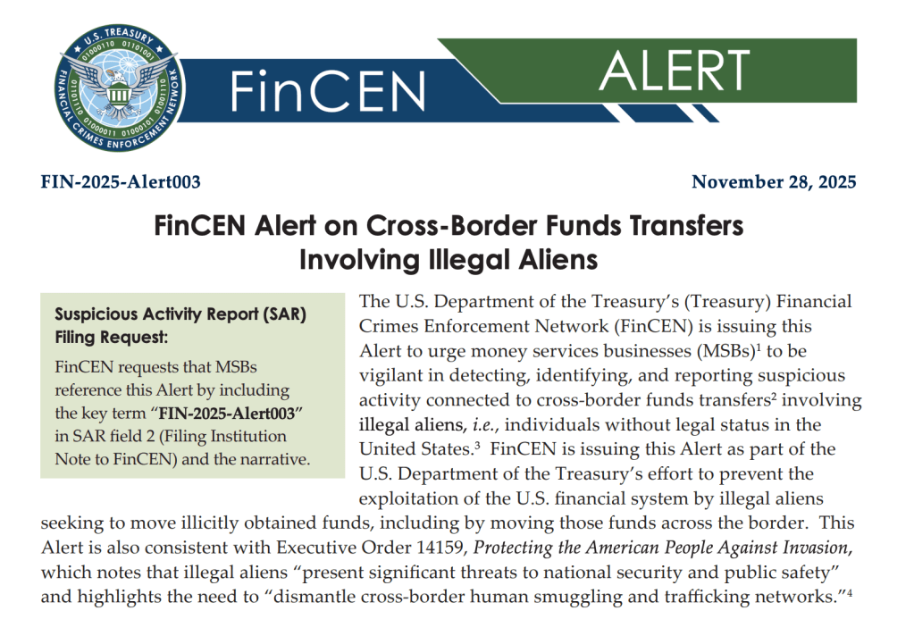 Así la Alerta FinCEN obliga a los MSB de EE.UU. a indicar en cada Reporte de Actividad Sospechosa (SAR) el código “FIN-2025-Alert003” cuando identifiquen transacciones vinculadas a “illegal aliens” (migrantes sin estatus), incluyendo envíos de remesas. En otras palabras: la alerta obliga a que empresas como Western Union, MoneyGram, fintechs y bancos en EE.UU. reporten como sospechosos los envíos de dinero asociados con migrantes sin estatus legal (usando la etiqueta). Siendo específicos los MSB aplicarán controles reforzados: