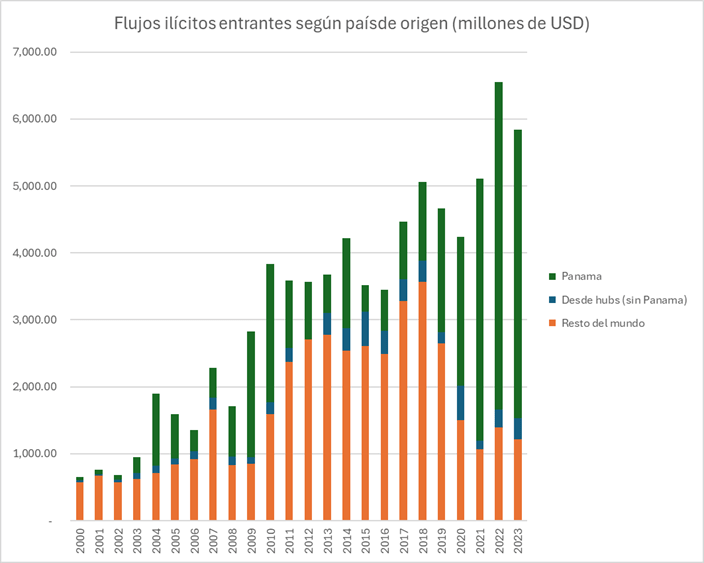 Los datos generados también permiten apuntar el rol de centros financieros y de lavado para el reingreso y reciclaje de estos capitales hacia el Ecuador. Si se agregan los datos distinguiendo los países de origen de los capitales entre Hubs internacionales financieros y de tránsito internacional- como Países Bajos, Hong Kong, Panamá y Emiratos Árabes Unidos- y el resto del mundo, se puede distinguir el componente de comercio exterior registrado en esas economías, que o son parte de una cadena más grande de importación/exportación; o, por el contrario, señalan circuitos offshore de reciclaje de capitales desde y hacia el Ecuador. Así, los flujos ilícitos de entrada provenientes únicamente de estos Hubs representaron 36,5 mil millones de dólares entre 2000 y 2023, correspondiente al 48% de los flujos de entrada totales.
