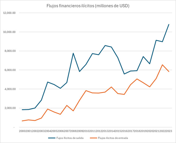 Por otra parte, si se deja de lado los flujos ilícitos estimados mediante desajustes comerciales y se observa la composición de la balanza de pagos- a través de la variación de activos externos de residentes no explicados por flujos financieros ni por el saldo de la cuenta corriente (Amerhauser et al., 2023; Cobham & Janský, 2017; UNODC & UNCTAD, 2020), se obtiene un volumen promedio anual de flujos ilícitos adicional de 3.4 mil millones de dólares, detenidos en depósitos externos, inversiones de portafolio, operaciones bancarias, entre otras. Lo que plantea que los flujos de salida no pasarían únicamente por el comercio, sino que ocurrirían también por canales puramente financieros. Más aún, exacerba la duda respecto al reciclamiento de capitales mediante centros offshore y la fuga de divisas a cargo de las élites económicas.