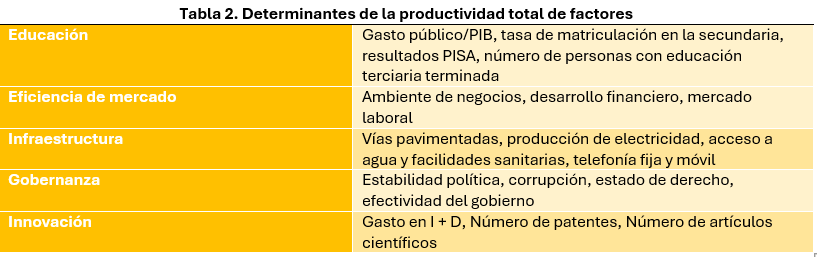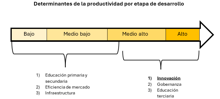 En las etapas iniciales, simples mejoras en infraestructura y educación básica y secundaria pueden generar mejoras en productividad. Pero una vez llegado a la etapa de ingreso medio-alto, mayor énfasis se debe dar a la gobernanza, educación terciaria y, sobre todo, a la innovación. Para continuar sosteniendo el crecimiento salarial y mantener costos laborales unitarios competitivos, se requiere ingresar a industrias con mayor sofisticación y valor agregado que operan a niveles más altos de productividad (Banco Mundial, 2024b). Esto es muy diferente a la visión conservadora que presenta como única alternativa a la reducción de salarios para continuar siendo “competitivos”. Por eso, la innovación es el principal determinante de la productividad en los países de ingreso medio-alto y alto porque permite elaborar nuevos productos o variaciones en sectores sofisticados que facilita sostener un nivel de ingreso cada vez más alto. Esto es crucial en países de ingreso medio-alto que tienen una fuerza laboral más educada en comparación con países de ingreso bajo, pero que no pueden ser productivos porque no existen los sectores intensivos en innovación, conocimiento y habilidades que los absorban.