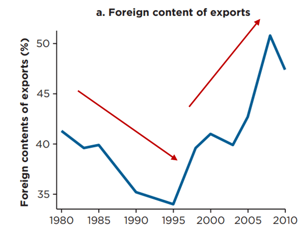 Para analizar un caso anecdótico, en el Gráfico 12 se puede observar cómo entre 1980 y 1995 Corea del Sur redujo el contenido importado en sus exportaciones lo que significa que empezaron a utilizar más insumos locales en sus procesos de producción. Esta es una etapa de salida de las cadenas globales de valor y de mayor valor agregado nacional. Luego, desde el año 2000 empezaron a vincularse nuevamente con las cadenas globales de valor al mover la producción de bajo valor a países como China y Vietnam.