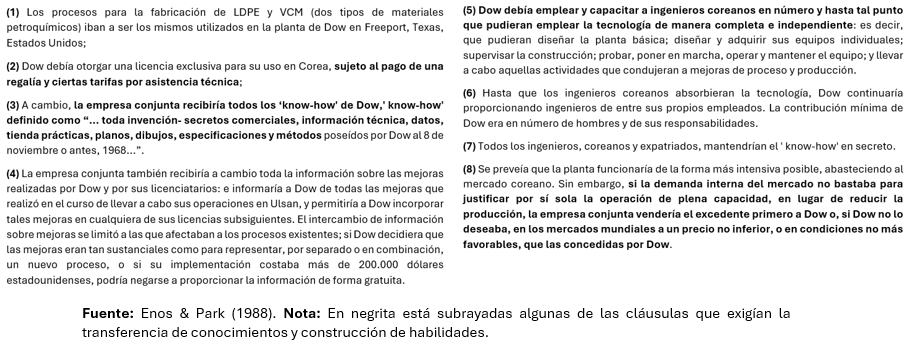 Con respecto a las licencias tecnológicas, estas son un tipo de colaboración entre una empresa local y una extranjera que ya domina la producción de un determinado bien. A través de una licencia tecnológica, la empresa extranjera se compromete a enseñar a la empresa local todo su conocimiento y know-how para que pueda adoptar las mejores y más avanzadas prácticas en determinada área. A cambio, la empresa local paga a la empresa extranjera regalías como un porcentaje de las ventas y exportaciones del nuevo producto. Este tipo de acuerdos, que muchas veces funcionan como un joint venture, permiten la acumulación de capacidades tecnológicas y la transferencia de conocimiento explícito y tácito que le permitirá a la empresa local continuar subiendo en la escalera de valor una vez concluido el acuerdo. A continuación, se muestra un ejemplo de un acuerdo de licencia tecnológica de 1968 entre una empresa coreana de petroquímicos y la estadounidense Dow:
