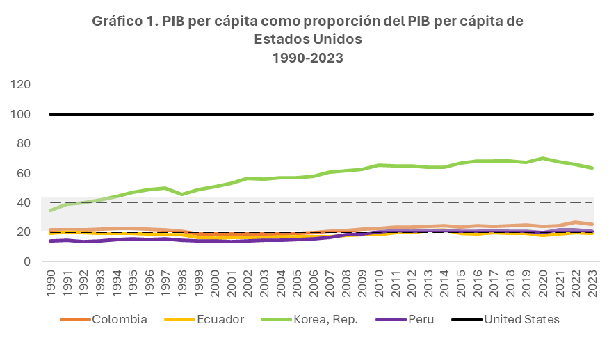 Cuando un país se encuentra, por un largo tiempo, dentro del intervalo de 20%-40% del PIB per cápita de Estados Unidos se dice que está dentro de la trampa de los ingresos medios (Lee, 2013). Esto sucede cuando la tasa de crecimiento del PIB se desacelera y resulta ser insuficiente para romper la barrera de ingreso alto en un tiempo relativamente corto. Si uno mira a Corea del Sur, este país superó el 40% del PIB per cápita estadounidense a inicios de la década de los noventa y ahora representa más del 60%. En otras palabras, Corea salió de la trampa de los ingresos medios y convergió hacia el nivel de vida de Estados Unidos. Lo opuesto sucede en todos los países andinos.