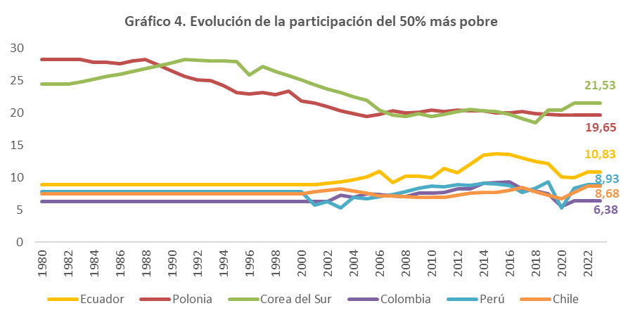 En el caso de Ecuador, a pesar de que tuvo un crecimiento mayor del 50% más pobre en comparación con otros países andinos, nunca llegó a superar aunque sea el 15%. Además, en la última década, la mayoría de los países andinos han mostrado una disminución en la participación del 50% más pobre.