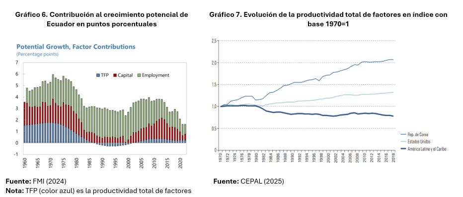 La evidencia muestra que salir de la trampa de los ingresos medios requiere pasar de una estrategia basada únicamente en la acumulación de capital físico, a una de crecimiento sostenido de la productividad. A medida que se avanza en el proceso de desarrollo, el rendimiento del capital ya no sigue siendo tan alto como era al inicio y por eso se deben buscar nuevos motores de crecimiento (Banco Mundial, 2024b). Esto no quiere decir que la inversión deja de ser necesaria, sino que se debe complementar con más productividad. En ese sentido, el principal problema de Ecuador y otros países latinoamericanos de ingreso medio es el bajo crecimiento de la productividad y su contribución al crecimiento agregado (Gráfico 6 y 7).