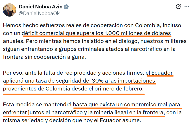 Noboa Azín, D. (2026, 21 de enero). [Publicación en X anunciando una “tasa de seguridad” del 30% a importaciones provenientes de Colombia] [Publicación en red social]. X.