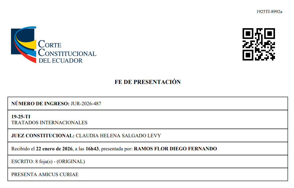 Yo, Diego Fernando Ramos Flor, ciudadano ecuatoriano, comparezco ante la Corte Constitucional del Ecuador en calidad de amicus curiae en el trámite de control constitucional del tratado bilateral de inversiones suscrito entre Ecuador y Emiratos Árabes Unidos (Caso No. 19-25-TI). Mi interés legítimo se fundamenta en mi trayectoria como investigador, ex-servidor público miembro de la Comisión de Auditoría de Tratados de Inversión (CAITISA) y docente universitario, lo que me permite aportar con elementos técnicos y jurídicos relevantes para el análisis del presente caso.
