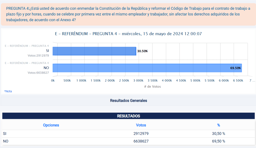 Pero no hace mucho tiempo, en la Consulta Popular de mayo 2024, ya se propuso el contrato de trabajo a plazo fijo y por horas cuando se celebre por primera vez (…) , y decían, “sin afectar los derechos adquiridos de los trabajadores”. Eso no pasó y para cualquier político y hacedor de política pública que se considere medianamente demócrata, el mensaje de su mandante (art. 1 de la Constitución) fue categórico. Siete de cada diez ecuatorianos dijeron «NO a la flexibilización laboral». Queremos mejores condiciones de trabajo, no peores».