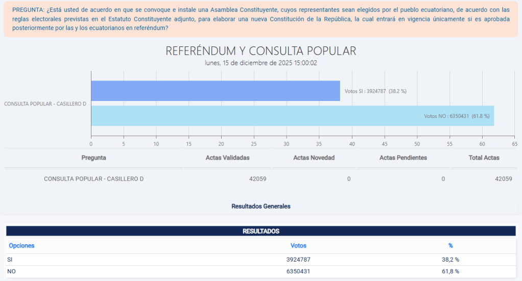 Este resultado fue ratificado en la consulta de noviembre de 2025. Seis de cada diez ecuatorianos dijeron NO a que se convoque e instale una Asamblea Constituyente para que cambie la Constitución.