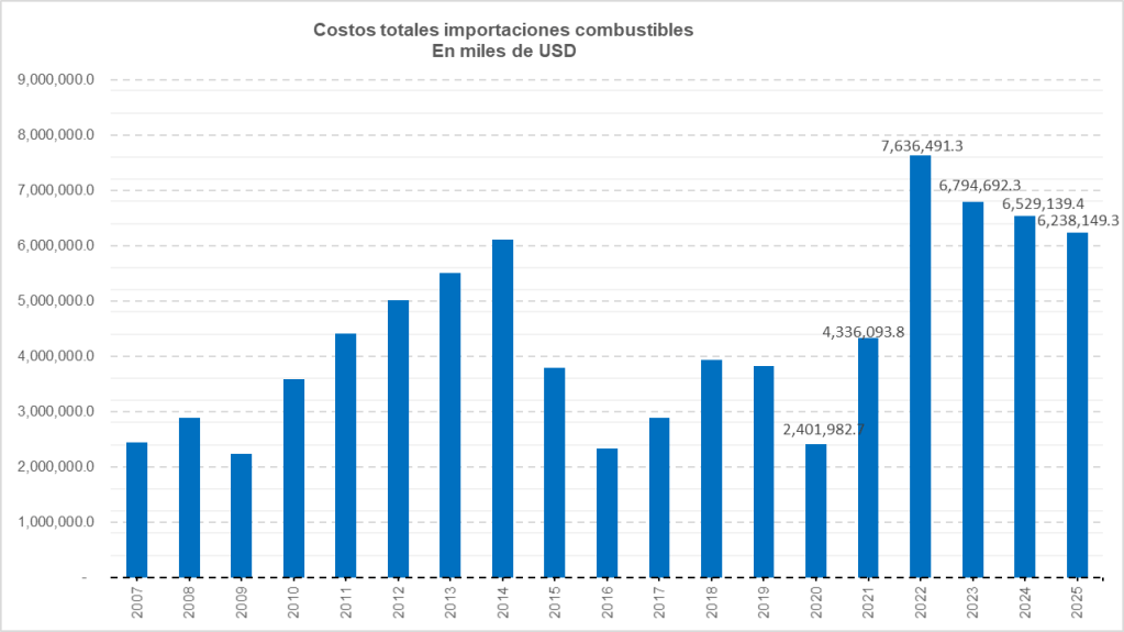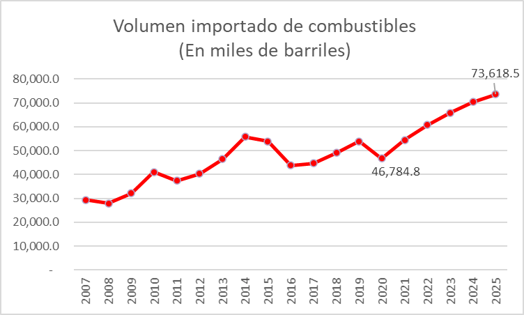 La demanda de combustibles importados en términos reales, como muestra el gráfico a continuación, ha sido creciente y al parecer se mantendrá en 2026 y en adelante, por lo que es fundamental recuperar la planificación energética. Si en 2020 importamos 46, 8 millones de barriles de combustible, en 2025 terminamos importando 73,6 millones de barriles.