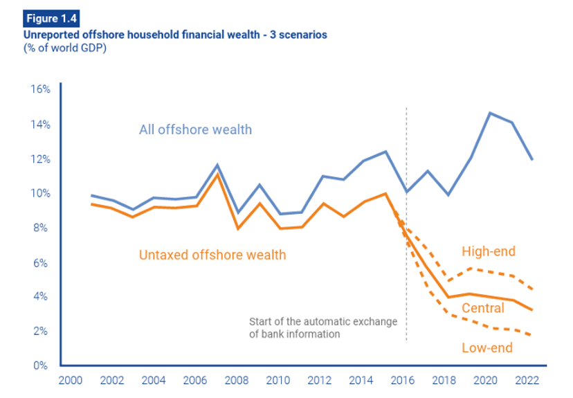 Oxfam, en una publicación reciente, señala que la riqueza depositada en paraísos fiscales se ha incrementado luego de la publicación de los papeles de Panamá. Si bien cae la riqueza offshore no declarada, aún sigue siendo alta (entre el 1,8% y 4,4% del PIB mundial), pese a los esfuerzos de intercambio de información entre las instituciones de impuestos de los países. Según sus estimaciones sería USD 3.55 billones de riqueza offshore no gravada con impuestos que proviene mayormente de países de renta media y baja. La riqueza offshore no declarada en 2024 sigue concentrada: el 0,1% más rico poseía USD 2.84 billones, mientras que el 0,01% más rico tenía USD 1.77 billones. El 0,1% más rico ha ocultado más riqueza no gravada en paraísos fiscales que la riqueza de la mitad más pobre de la humanidad, esto es 4.100 millones de personas.
