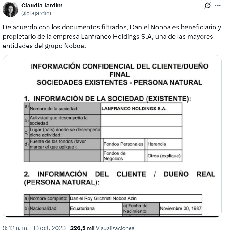El pacto ético que ganó mediante consulta popular en febrero 2017, prohibió a cualquier persona que ocupe dignidad de elección popular o que se desempeñe como funcionario público, tenga activos o capitales en paraísos fiscales, lo que no ha pasado de declaraciones juramentadas que ni la misma Contraloría hace seguimiento y control. Uno de los casos que debió haber motivado la investigación rigurosa de los organismos de control fue la afirmación que hizo la periodista Claudia Jardim en Folha de Brasil respecto a que el Presidente en funciones, Daniel Noboa, sería beneficiario y propietario de Lanfranco Holdings S.A (conglomerado de la familia Noboa), con sede en Panamá.